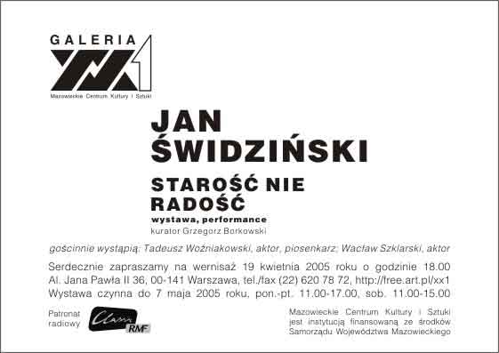 Tytuł wystawy i pokazu Jana Świdzińskiego w XX1 wydaje się jasno wskazywać temat, którego dotyczy. Jednak starość jest tu pewnym znakiem, który wcale nie musi być jednoznaczny. To pewien stan pustki powstałej po porzuceniu czy utraceniu pewnych pojęć, stanowisk, poglądów. To także sytuacja wolnej przestrzeni, tak przestronnej, jak puste niemal pomieszczenie galerii w czasie tej wystawy. Jest to zatem stan możliwości przyjęcia czegoś, stan otwartości, a nie definitywnego zakończenia.